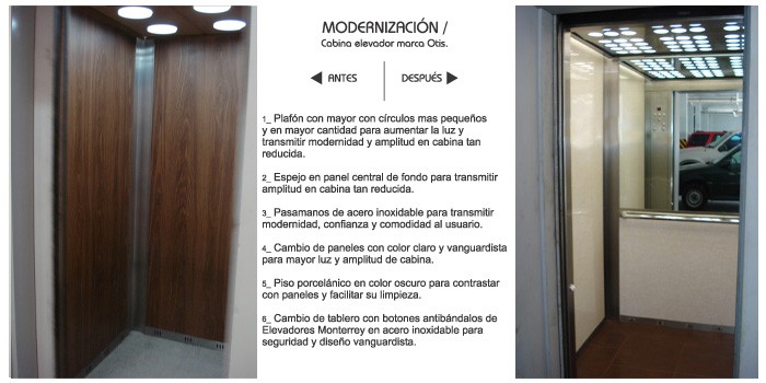Elevadores Monterrey le ofrece la actualización de su cabina desde el piso, plafón, paneles, tablero, puertas, etc.